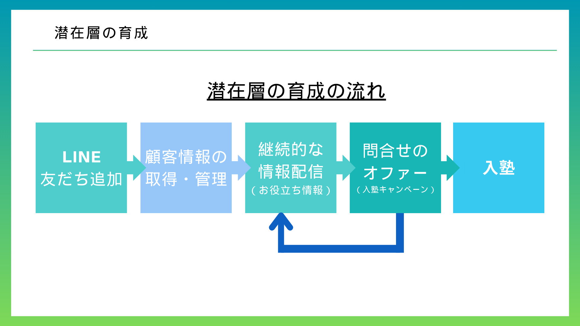 様々な方法で潜在顧客が塾を知った場合でも、最終的にはLINE公式アカウントに流れ込むように設定することが重要です。