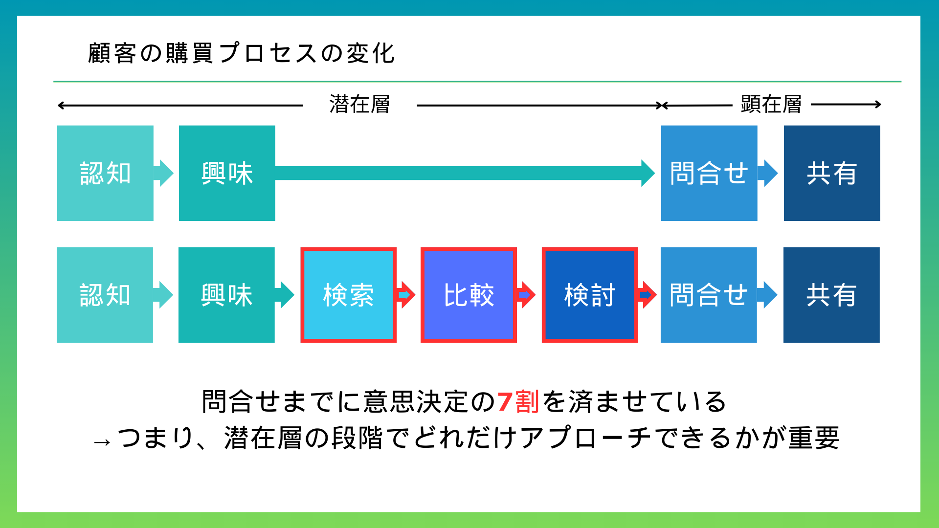 この変化により、認知から問い合わせまでのプロセスが長期化しており、顧客は意思決定のほとんどを済ませてから問い合わせを行う傾向があります。