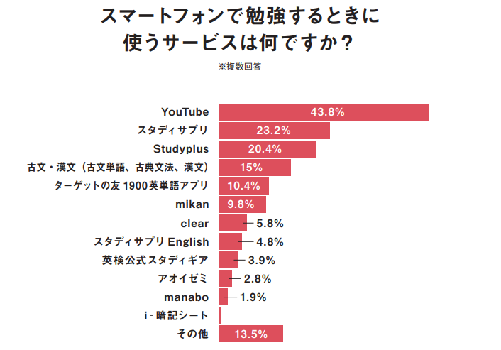そして、「スマホで勉強するときに使うサービスは何か?」という問いに対しては、「スタディサプリ」や「スタディプラス」などを押さえて「YouTube」と回答した人の割合が一番大きくなっています。