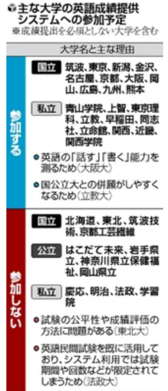 英語民間試験に参加する大学、しない大学
