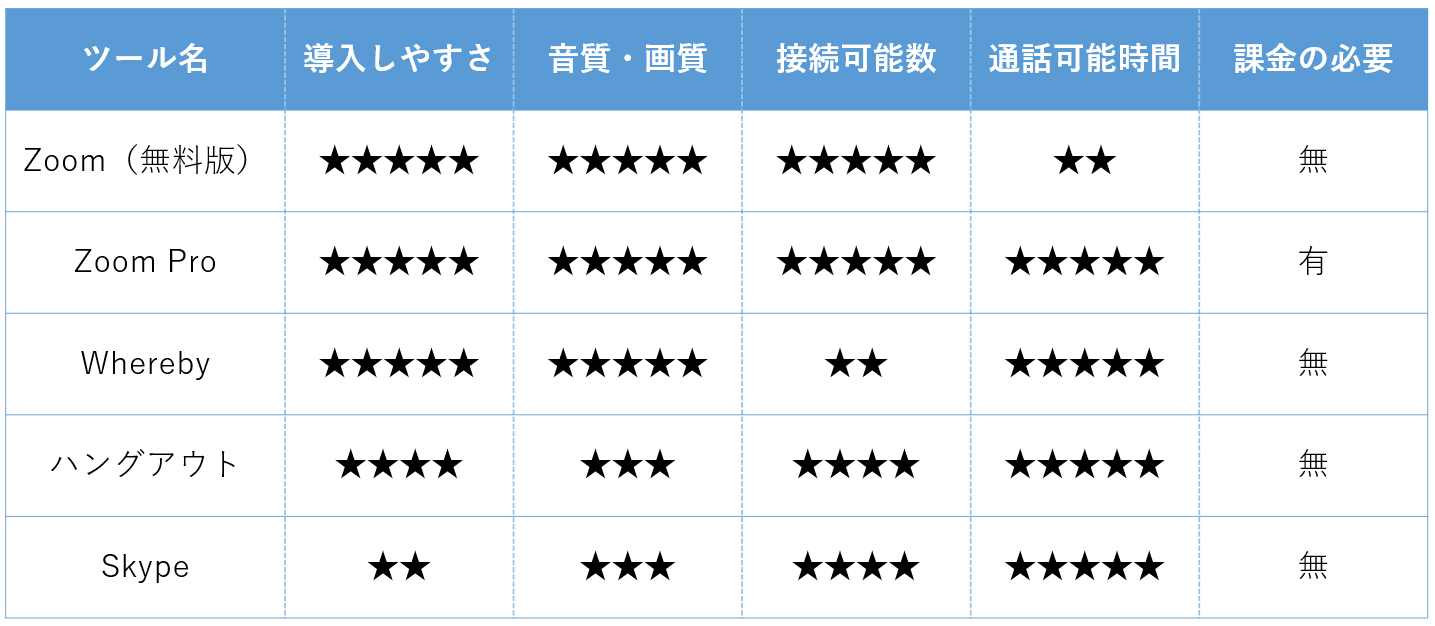 導入しやすさ、音質・画質、接続可能数、通話可能時間を5段階で評価しているので、参考にしていただければと思います。