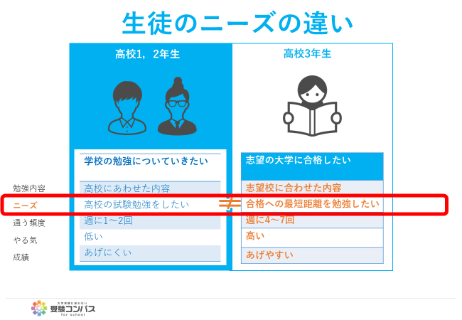 上の図は、高校生のニーズを、高校1,2年生と3年生に分けてまとめたものです。高校1,2年生の中にも、確かに受験を目標にしている生徒がいるとは思いますが、とりあえずは「高校の勉強についていきたい」「高校の試験勉強をしたい」というのが塾に求めていることでしょう。それに対し、高校3年生は、「志望校に合格したい」、だから「最短コースで効率のよい勉強をしたい」と思っています。
