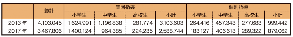 集団指導は約52万人減少、個別指導は12万人減少です。集団指導の減少率は17%個別指導の減少率は、13%です。
