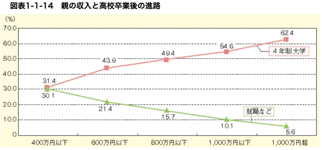 年収400万円以下の家庭では、就職と4年生大学に進学する割合が30%とほぼ同じです。
