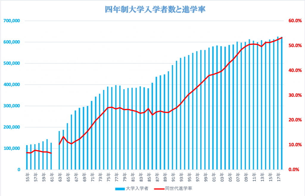 前回のコラム、統計データで見た学習塾の未来にも書きましたが、大学進学率は2018年で57.9%と過去最高の大学進学率となってます。