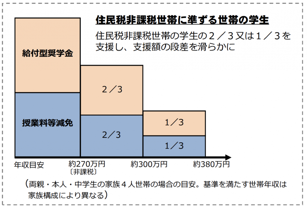 世帯年収が270万円以上300万円未満だと授業料・入学金の減免額ならびに奨学金給付額が住民税非課税世帯の2/3、300万円以上380万円未満だと同じく1/3の金額となります。