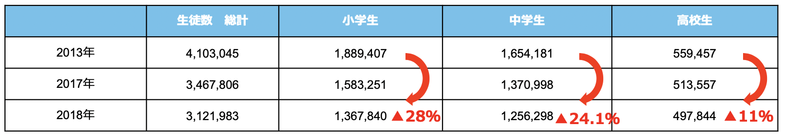 先ほどの生徒数を指導スタイルに関係なく、小学生、中学生、高校生で比べてみました。減少率は、小学生28%、中学生は、24%、高校生は11%です。
