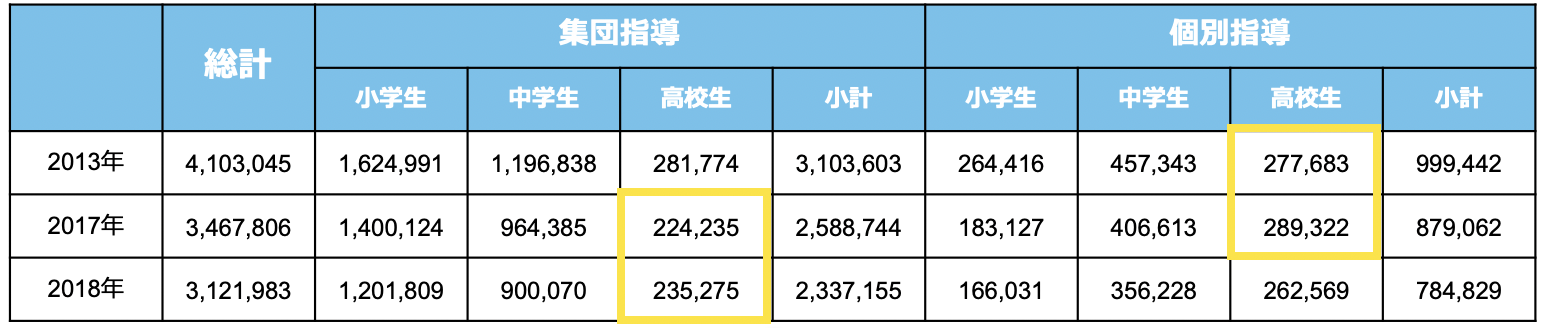 ここで、不思議な数字の推移が一箇所ありますね。高校生の集団だけ4.9%増加してます。前回のコラムで2013年→2017年の高校生の個別のみ4%増加してますと、記載してから1年間でこんなに生徒が指導形態の推移があります。こんな動き方は、通常あり得ないですよね。でもよく考えてみてください。予備校がかなり苦しくなっているのに、集団指導が増えることって考えにくいですよね。