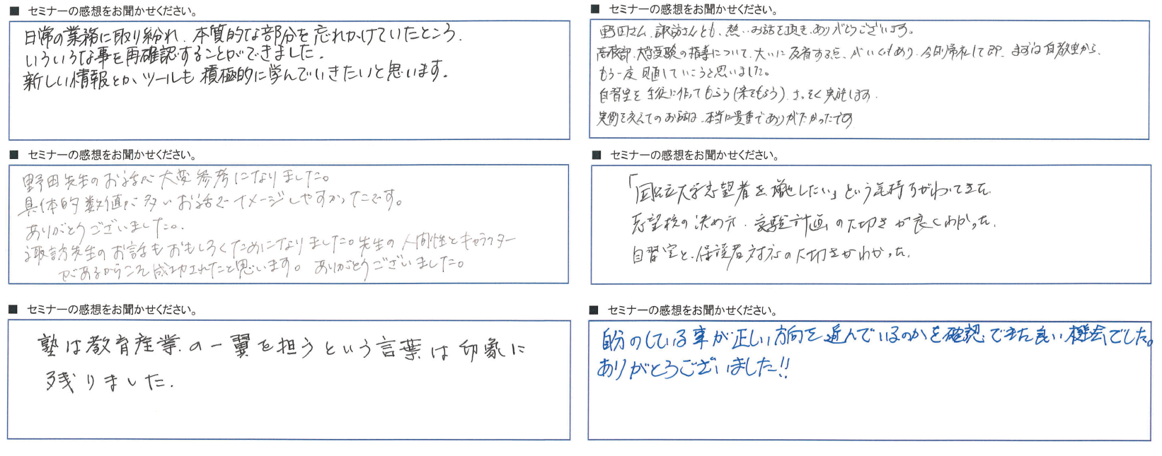 下記、ご参加いただいた皆様のアンケートの一部です。少しでもみなさまのお役にたてましたら幸いでございます。ありがとうございました。