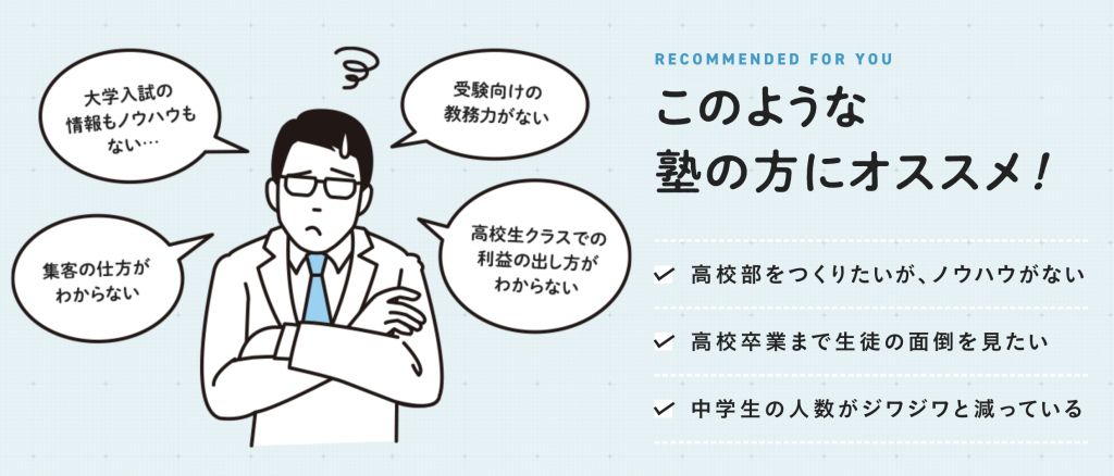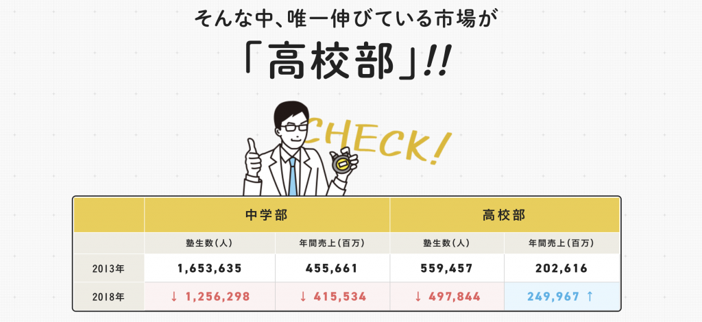 ごらん頂いたように学習塾の市場で唯一伸びているのが高校部です。ただし、高校部の運営は中学部の運営と大きく異なります。その部分にフォーカスして今回は無料セミナーを開催させていただきます。