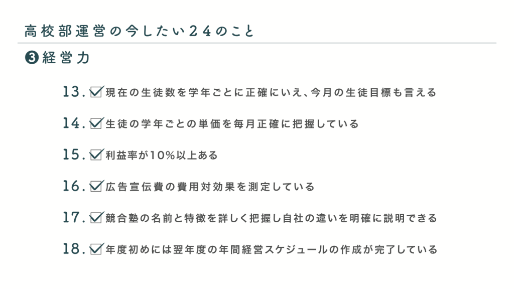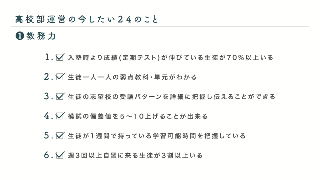 今回のゲストは、1教室100名以上の学習塾を3教室運営しているFreewill学習塾の柴山先生をお呼びして、「高校部運営24のチェックリスト」を使いながら、柴山先生が現場でどのように運営されているのか、Lacicu(ラシク)服部がリアルなところを掘り下げていきます。