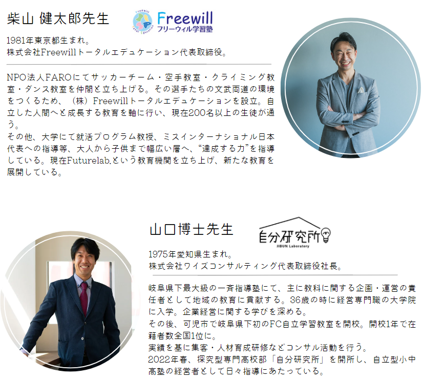 今回のセミナーは、学習塾のコンサルタントとしてもご活躍されるFreewill学習塾の柴山先生と自分研究所の山口先生の両氏をお招きします!