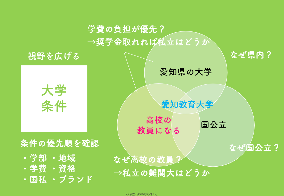 例えば、「愛知教育大学に行きたい」っていう生徒がいて、なぜかと聞くと、