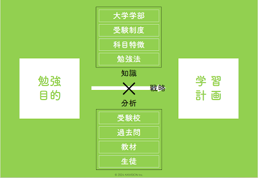 受験戦略には、学習を始める前に立てる「学習戦略」と、出願する大学を決める「出願戦略」の2つの軸がありますが、本セミナーでは「学習戦略」についてお話しします。