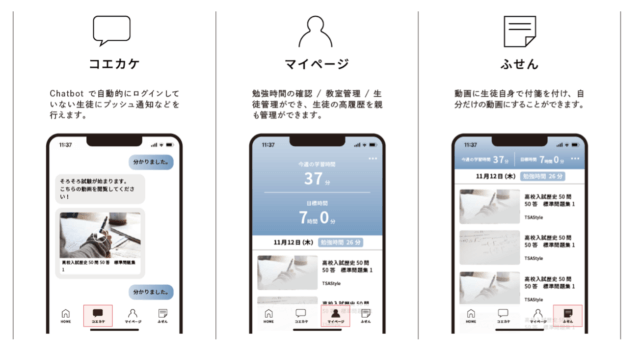 機能としては、視聴時間を計測できる”マイページ”、チャットポッドを利用した”コエカケ”機能、視聴動画の重要な部分だけを保持できる”ふせん”機能など多岐に渡ります。