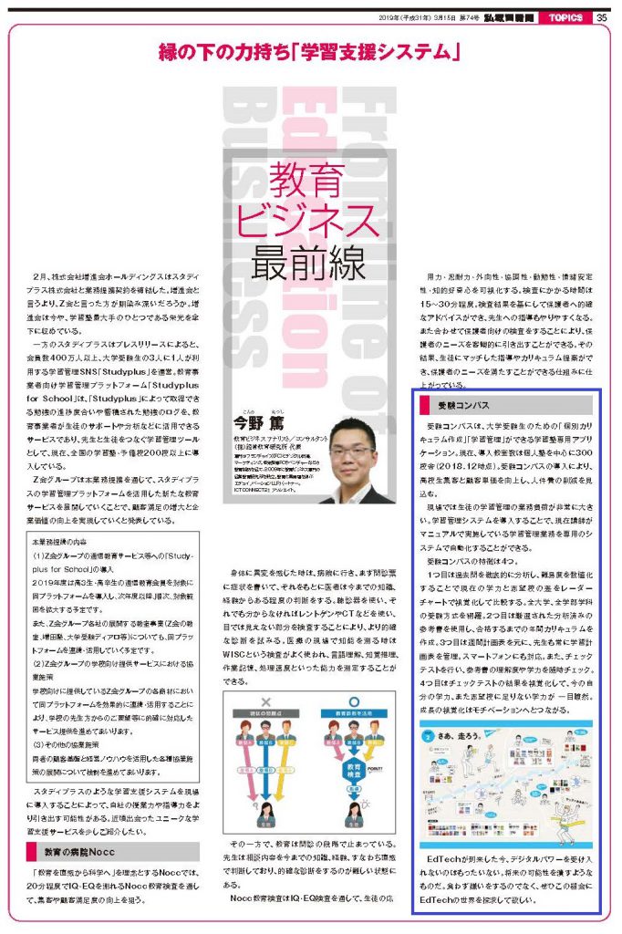 私教育新聞3月号の教育ビジネス最前線(今野篤氏)のコラムに、受験コンパスの記事が掲載されました。