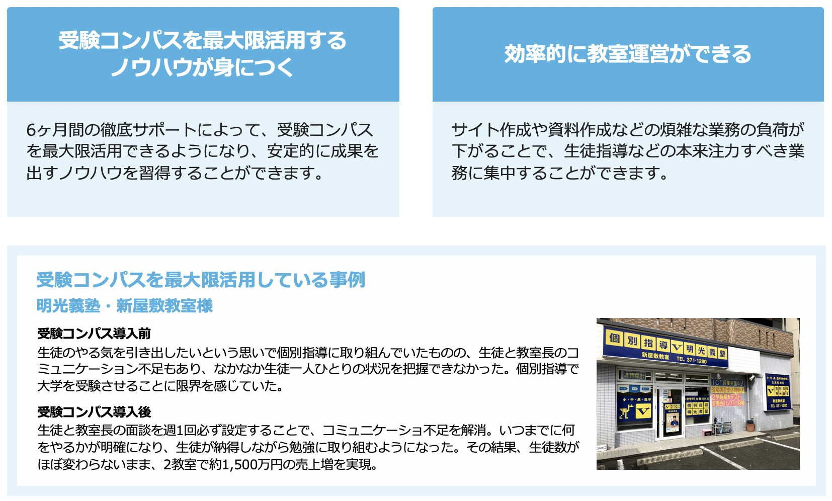 受験コンパスの導入で、難関大学への合格実績が出たり、高校部が圧倒的な収益源になったところもあれば、導入したものの全く利用できてません。今年は高校生がいませんといった声も少なくありません。