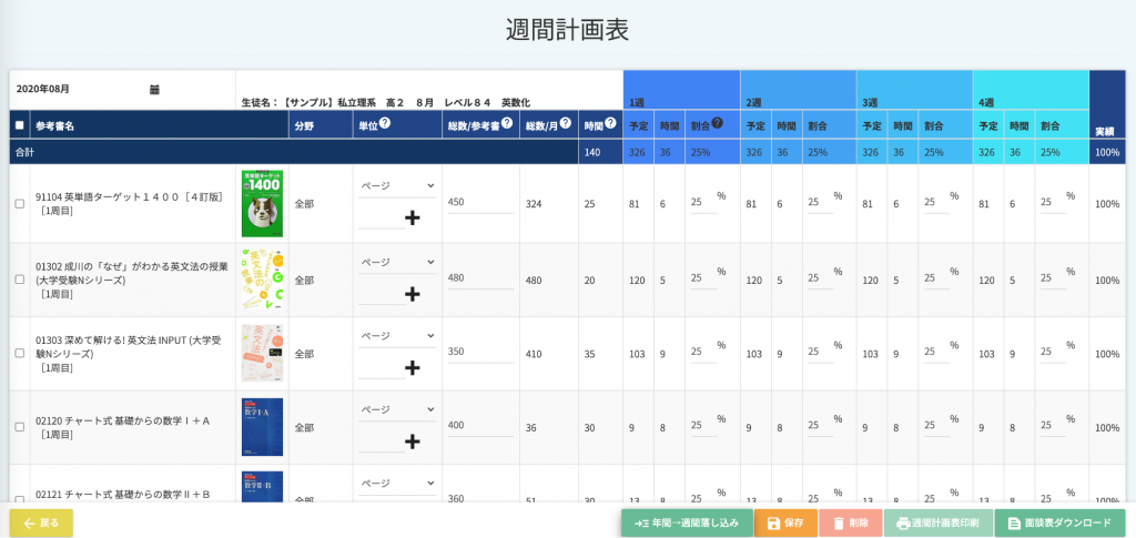 (週間計画表印刷画面:こちらを生徒に渡します)