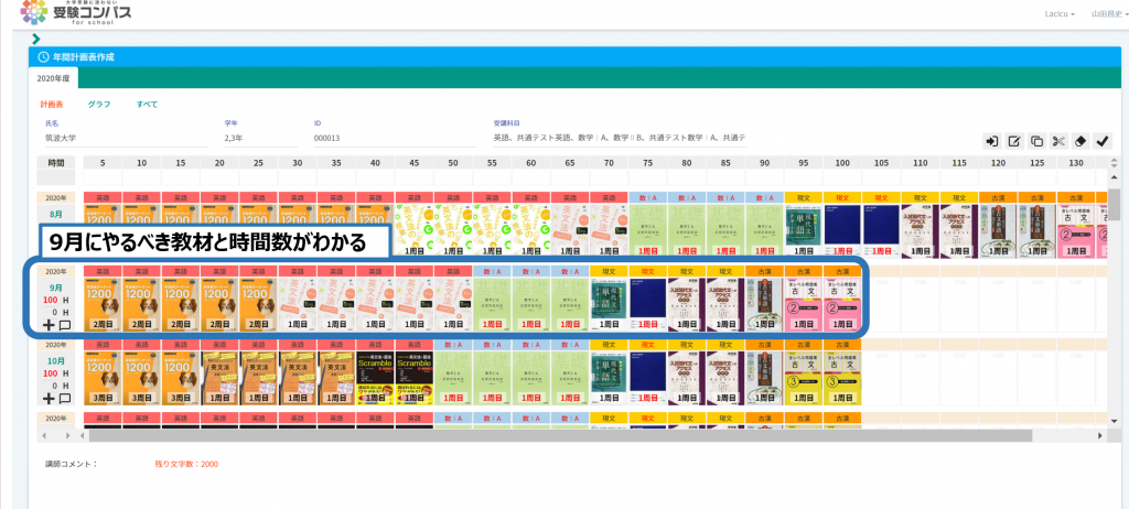 これにより、志望校から逆算した年間計画表で、どれぐらいの進捗状況なのかを一目で視覚化できます。