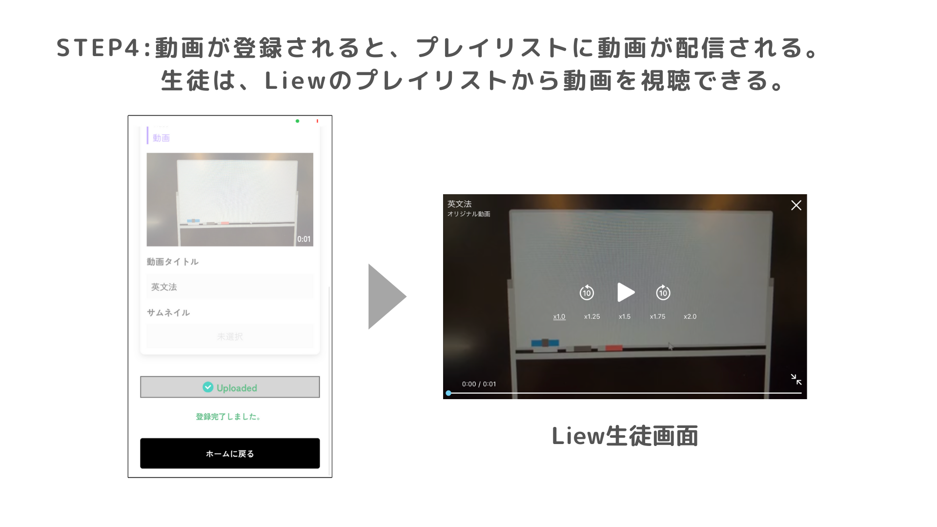 Liew for Managerがあれば、スマホ1つで、授業終了から2分ほどで動画を配信できます。