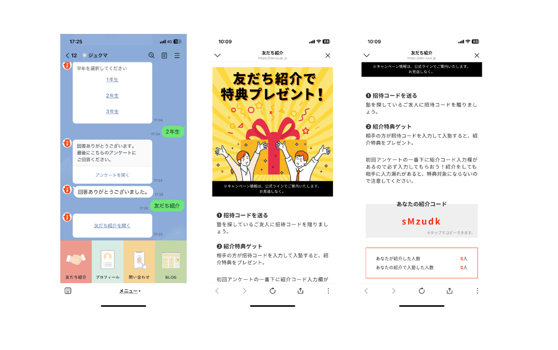 生徒・保護者がボタンをタップすると紹介ページが立ち上がり、簡単に自身の紹介コードを友だちへ送ることができます。