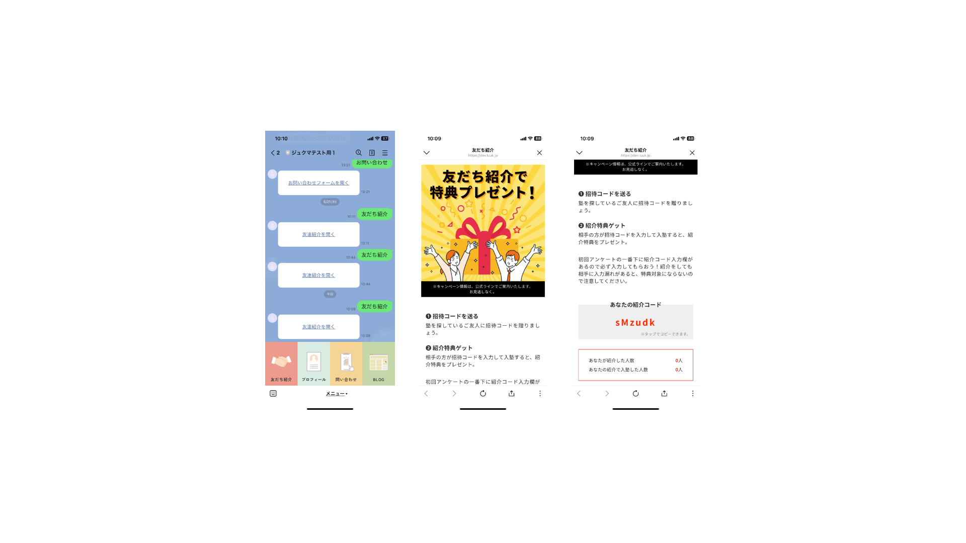 ジュクマと連携すると、LINE公式アカウントのリッチメニューに友だち紹介ボタンが設置されます。