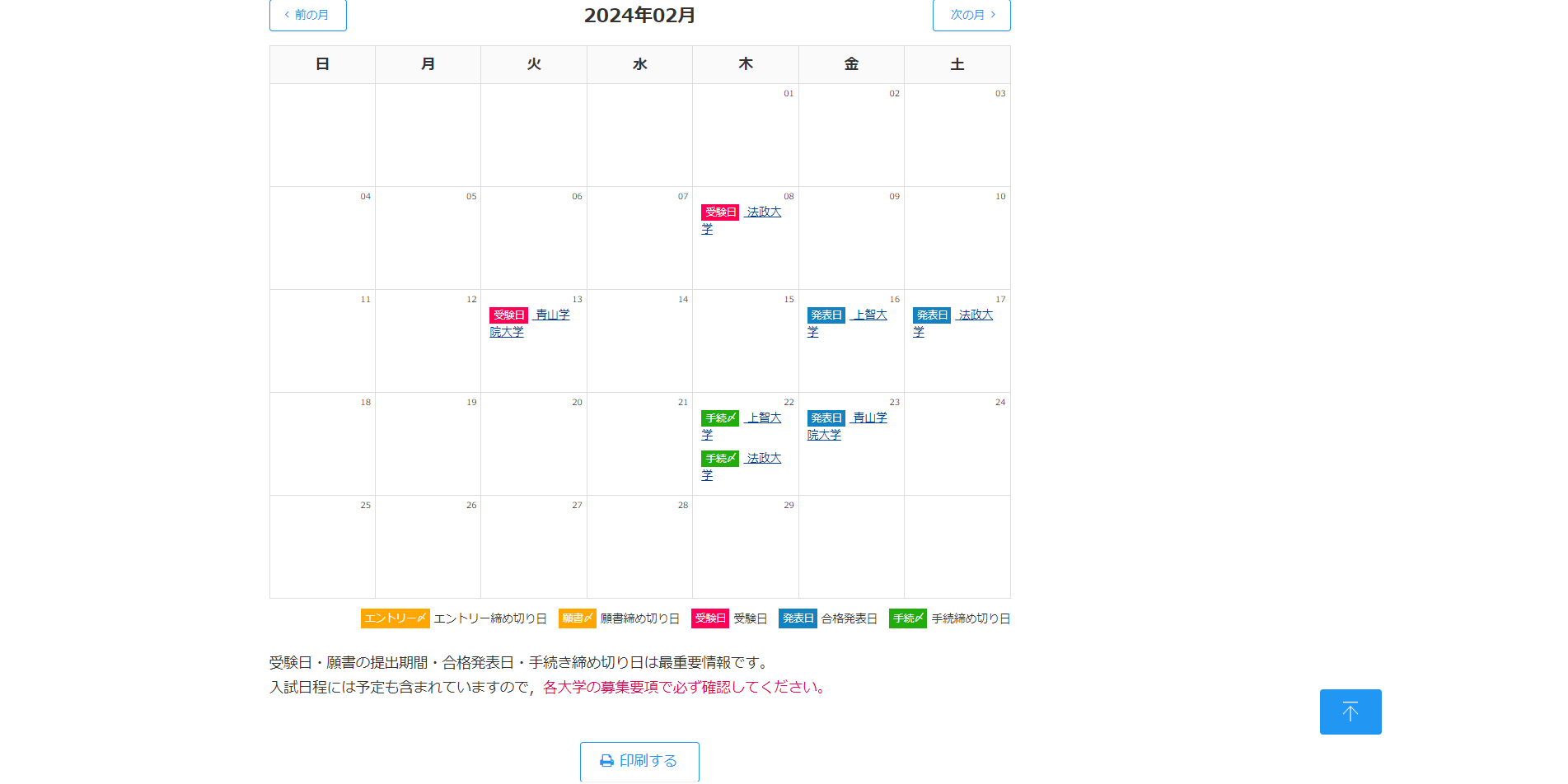 また、生徒がマイページに登録している志望校の受験日・願書締め切り日・合格発表日・手続き締め切り日が、カレンダーに自動で反映されていきます。